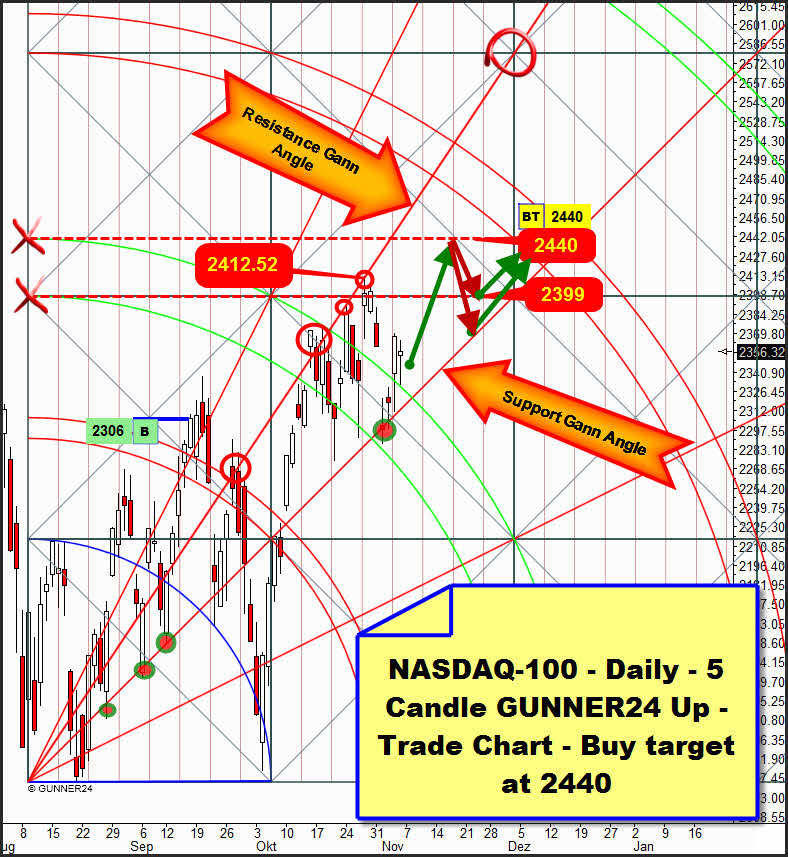 Furthermore, after the course high of 10/27 at 2412.52 the 2nd double arc intercepted the last rebound from the resistance Gann Angle. The market closed the week above the 2nd double arc again, thereby the preconditions keep on being present for the 3rd double arc to require being headed for. The 2440-2450 at the upper horizontal resistance line (it arises where the upper line of the 2nd double arc intersects with the starting point of the setup) seem the most likely price target. New year-high!! It looks as if the market could afterwards fall back just only to the 1*1 support again (or just onto the 2399) being able to head for the 3rd double arc with a lower high or a double top in terms of timing before being obliged to turn downwards by the end of November/beginning of December. First target then will be the 1*2 Gann Angle at 2260. At 2440 we'll cover our daily long position.
