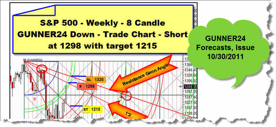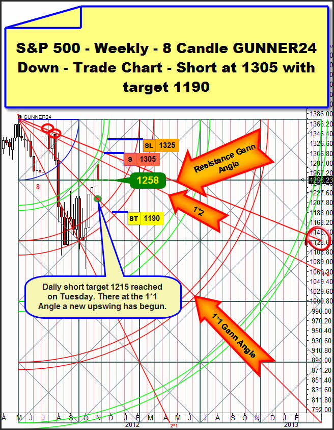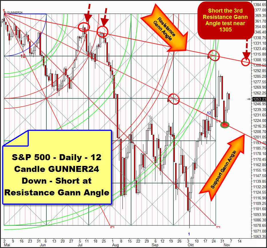 In the weekly 8 Candle GUNNER24 Down Setup we can see how the market marked its low exactly at the 1*1 Gann Angle escaping beyond the square line support at 1258. By the closing price above 1258 the market newly demonstrated that it's prepared at least to head for the 1*2 Gann Angle – in order to touch it finally. The 1*2 Gann Angle is a magnet that has got to be TOUCHED! Without this touch no significant downswing can start. But most likely the market wants to climb to the next higher level. Probably it would like to head for the resistance Gann Angle anchored outside right in the setup, at 1305. On weekly basis that one was retested twice in July already (red circles), and the definite rebound from it finally led down to the significant October lows. Now a third test is very likely, simply because it's a very, very important magnet that wants to be tested again. Here, a short-entry with good prospects is offering itself. According to W. D. Gann at a Gann Angle the rule of three and the rule of four namely take effect where we always have to reckon with some vehement moves – either with a significant rebound or with rapid trend acceleration. (On the ideal entry, please, pay also attention to rule # 24.3 in the Complete GUNNER24 Trading and Forecasting Course).